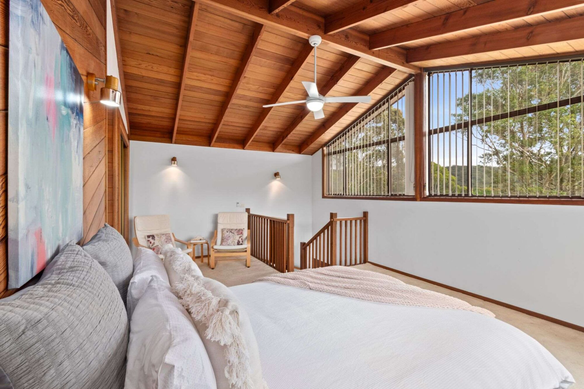 The Upper Level contains a spacious Master suite (queen bed) with built-in robes and en-suite, offering a lovely outlook to north and east. In addition, it contains a small bedroom with a single bed.