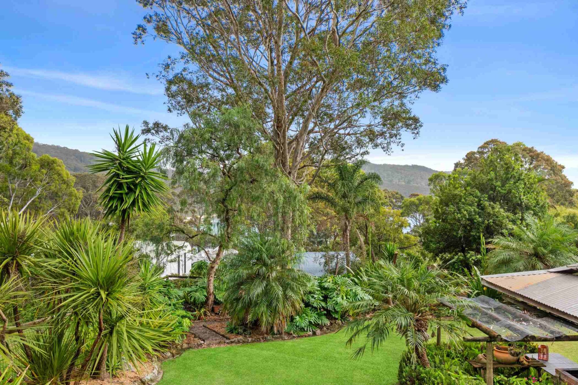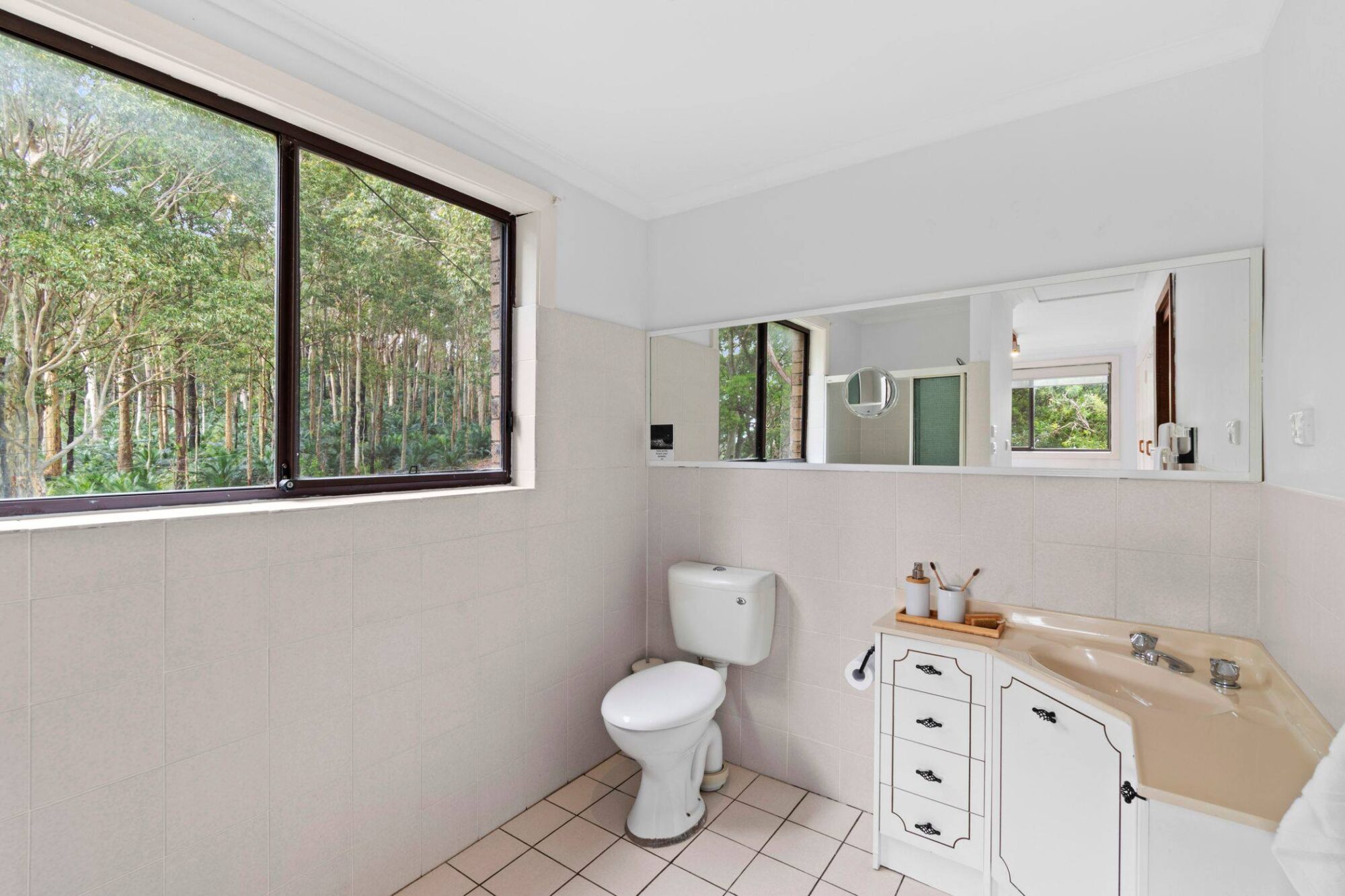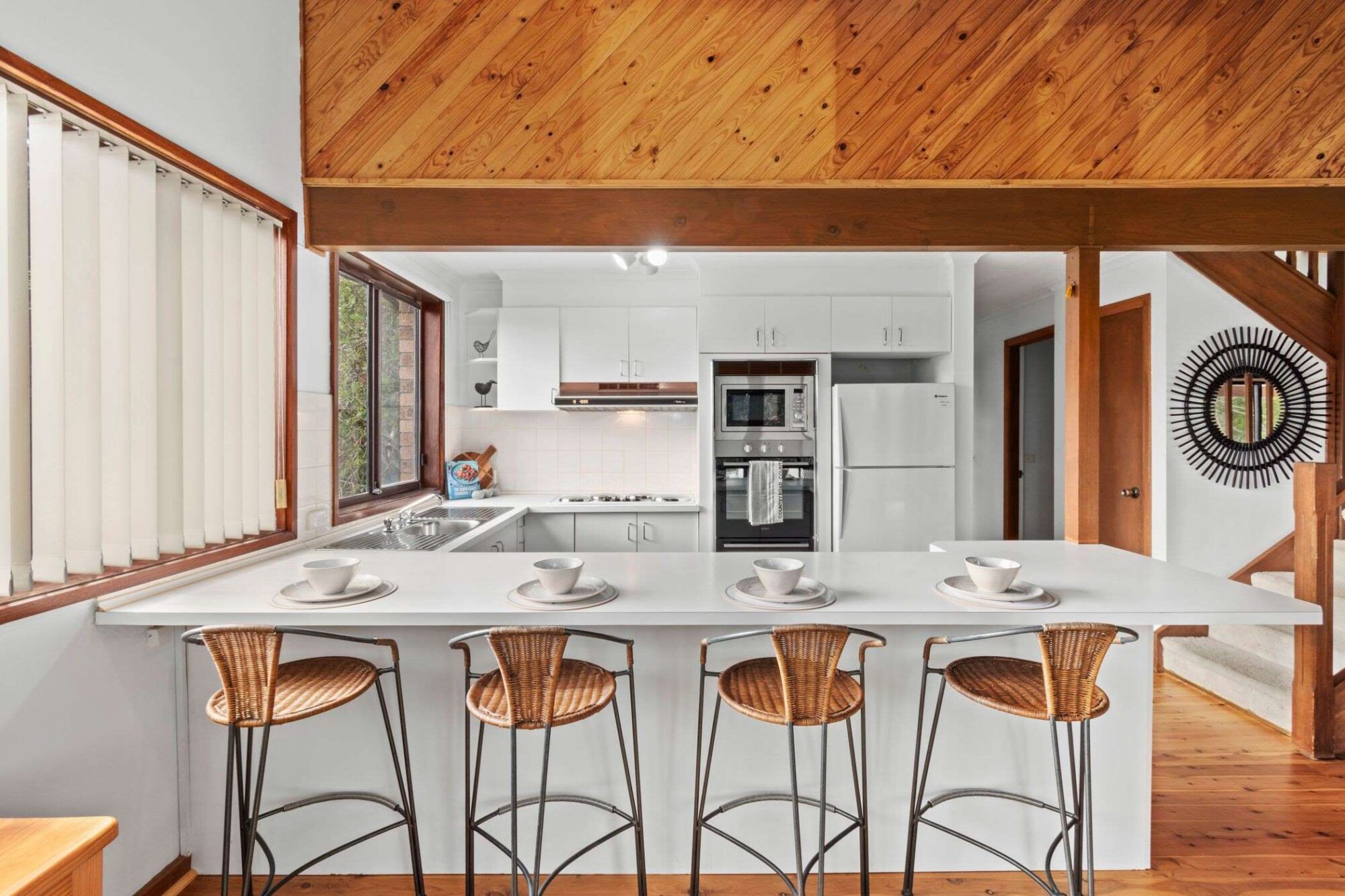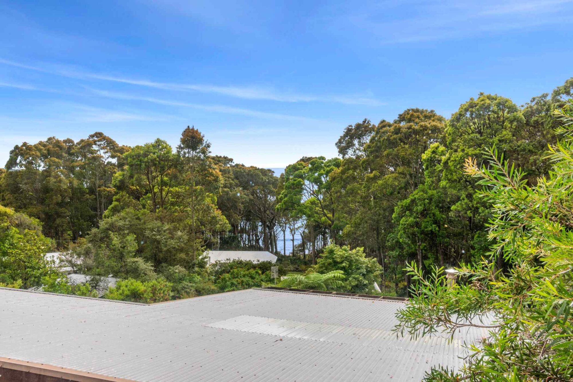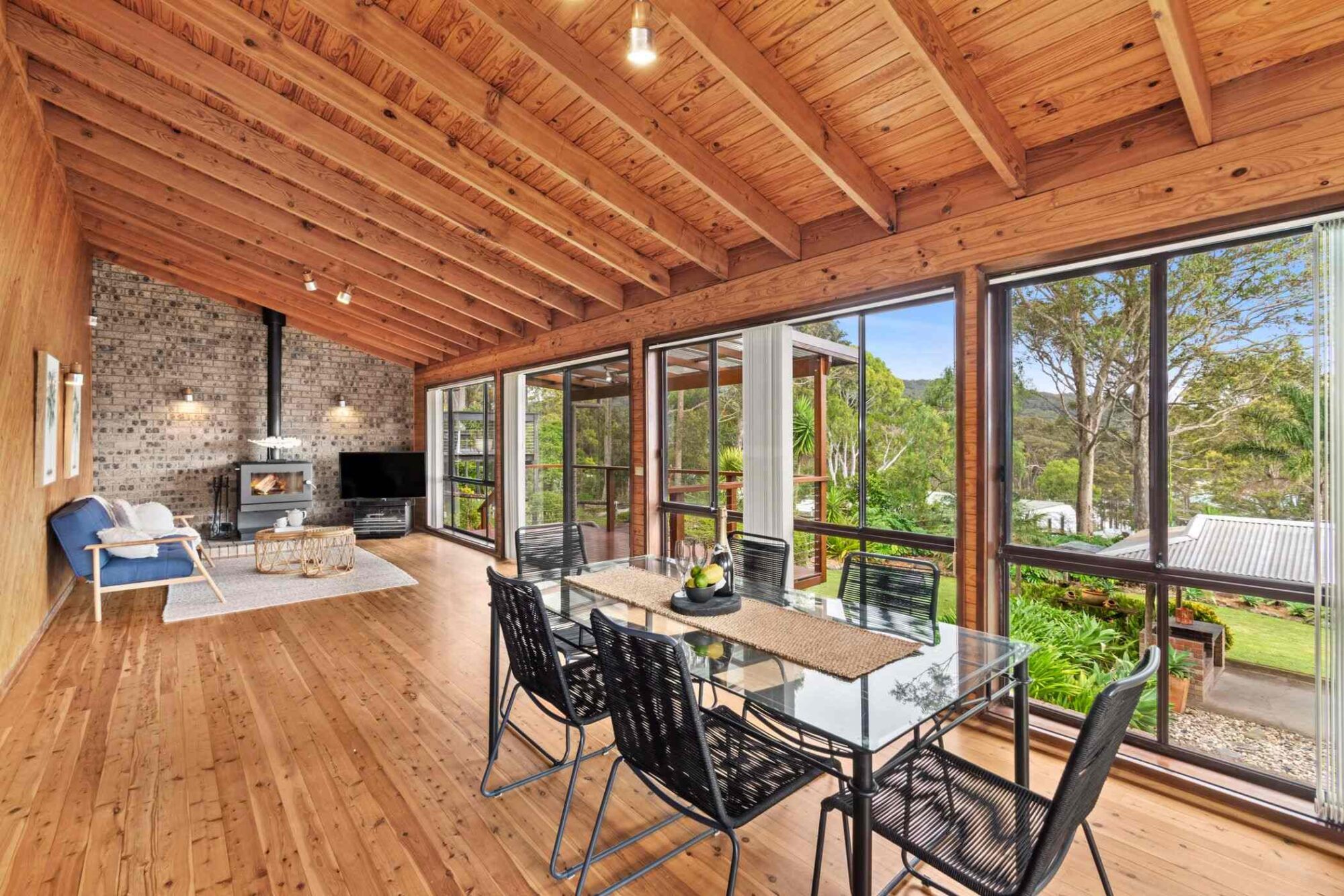 The entry Ground Floor has an inviting open-plan layout seamlessly connecting living, dining, and kitchen spaces. This level is adorned with expansive windows that offer garden views and also scenic views to Durras Mountain and Murramarang National Park. There are north beach/ocean glimpses through the trees.
